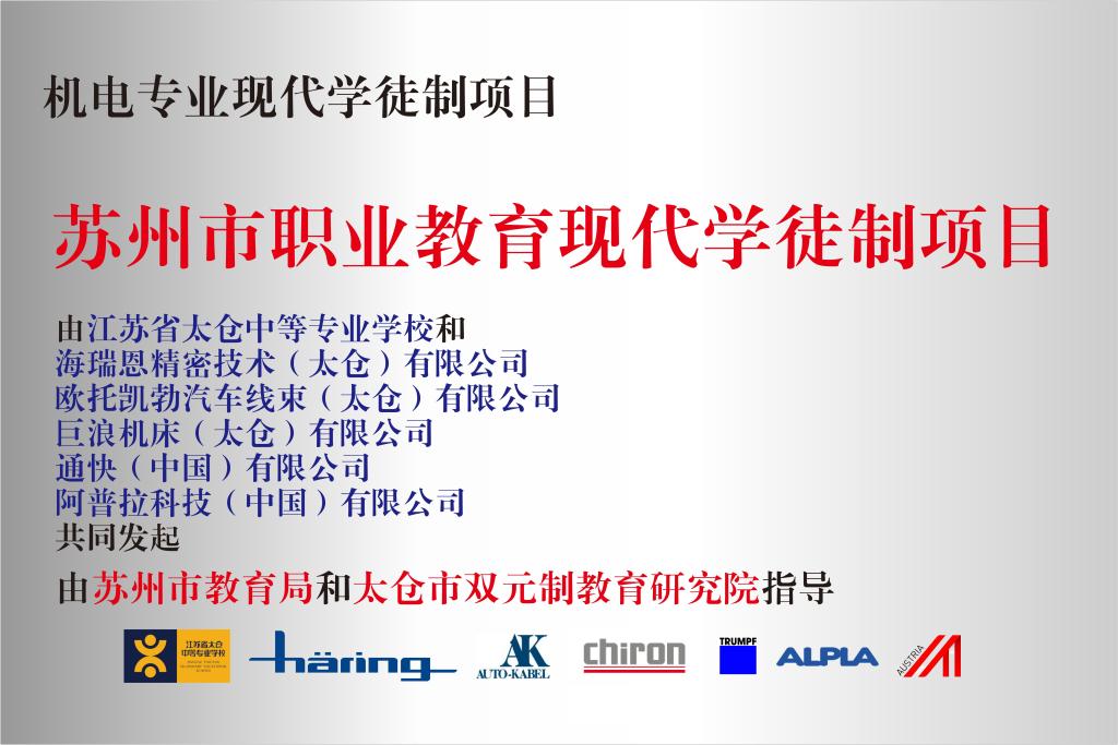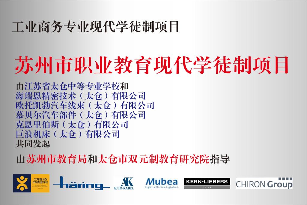 2018年10月,学校与欧托凯勃汽车线束(太仓)有限公司签约,校企行共建“双元制”学徒培训中心,培训中心建在欧托凯勃汽车线束(太仓)有限公司内部,按照“一校多企”现代学徒制治理结构,以企业为主导,校企共同培养机电设备技术、工业商务等专业技术人才。合作项目先后获评苏州职业教育市现代学徒制试点项目、苏州市校企合作示范组合、苏州市优秀企业(产业)学院等荣誉,2023年3月公司获评江苏省产教融合型企业。