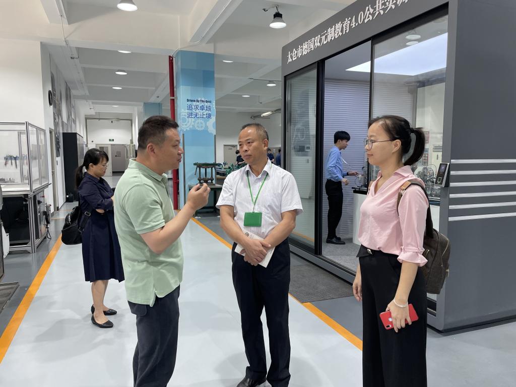 考察团参观了太仓德资企业专业工人培训中心(DAWT),培训中心王振东老师向调研团队详细介绍了DAWT的发展历史、运作模式、学生考核机制以及“双元制”教育模式的优势和成果。随后,考察团实地参观了学校东仓路校区的校内实训厂室及现场教学,并与授课教师与学生进行了互动与交流。