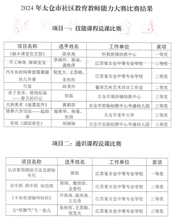 在2024年太仓市社区教育教师能力大赛中,我校参赛作品获一等奖1项、二等奖4项、三等奖2项,向获奖的老师表示祝贺!