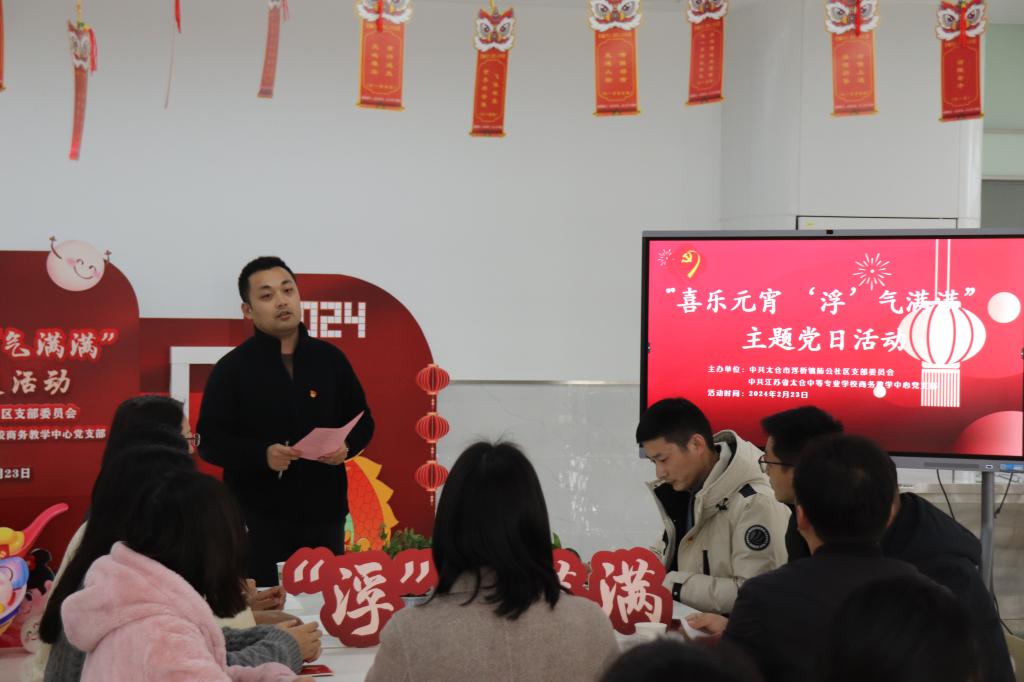 在元宵节佳节来临之际,为充分发挥中华传统节日“厚植家国情怀、培育精神家园”的重要作用,发挥党员、青年和团员在传统节日文化传承中的重要作用,弘扬元宵传统民俗文化,同时普及垃圾分类知识。2024年2月23日,lejing乐竞体育(中国)官方网站-登录入口商务教学中心党支部与陆公社区党支部联合举办“喜乐元宵 ‘浮’气满满”主题党、团日活动。浮桥镇垃分办副主任张海江,浮桥镇团委书记顾婷、副书记夏佳凯,陆公社区党支部书记黄刚、副书记张新峰、副主任陆艳红,学校党委书记陆金华,商务教学中心全体党员教师、部分团员教师和学生代表共50余人参加了本次活动,活动由商务教学中心主任陆志良主持。