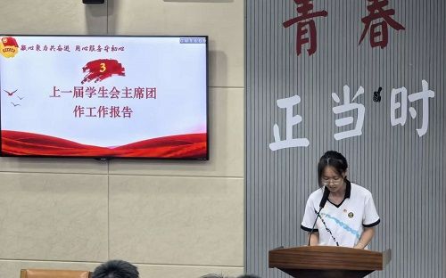 第三项议程:上届校学生会主席团代表艺术2152陈姜卉进行工作汇报。她回顾了过去一年学生会在校园文化建设和志愿工作等方面的突出贡献,同时也指出校学生会工作中的不足,为今后的工作提供了宝贵经验。