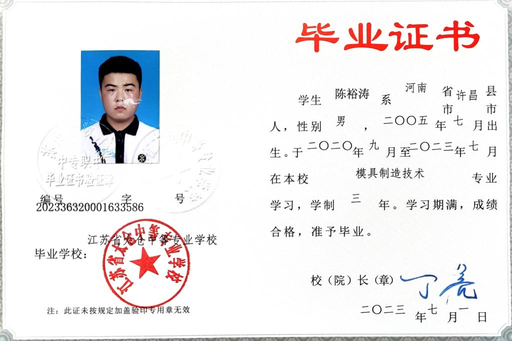 陈裕涛,男,2020年9月入学,就读于三年制模具制造技术中德2021班。